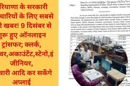 Haryana के सरकारी कर्मचारियों के लिए सबसे बड़ी खबर! ऑनलाइन ट्रांसफर ड्राइव हुई शुरू; क्लर्क, ड्राइवर, अकाउंटेंट, स्टेनो, इंजीनियर, पटवारी आदि 9 दिसंबर से कर सकेंगे अप्लाई